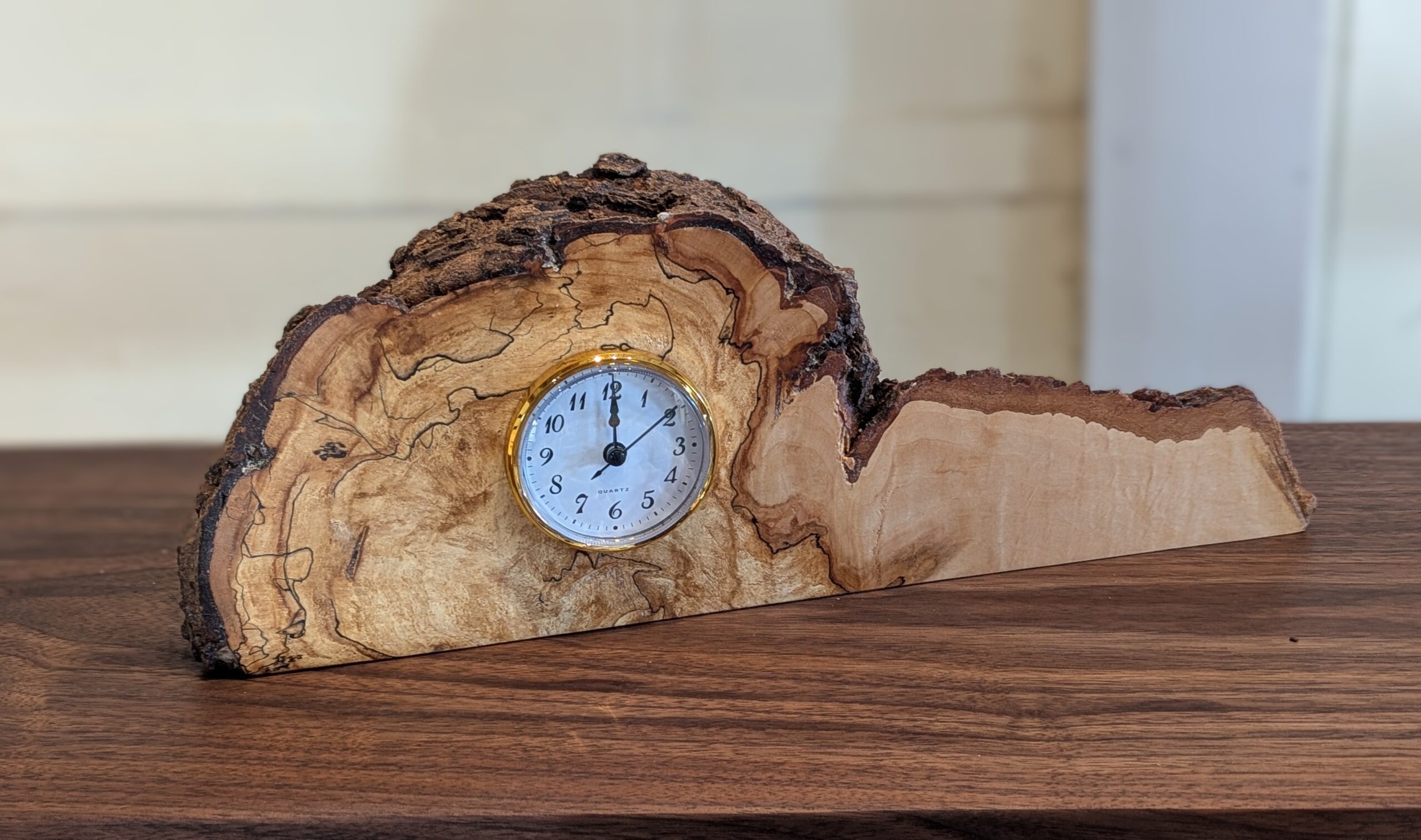 This maple wood clock measures approximately 5″L x 12W x3.2″ deep
